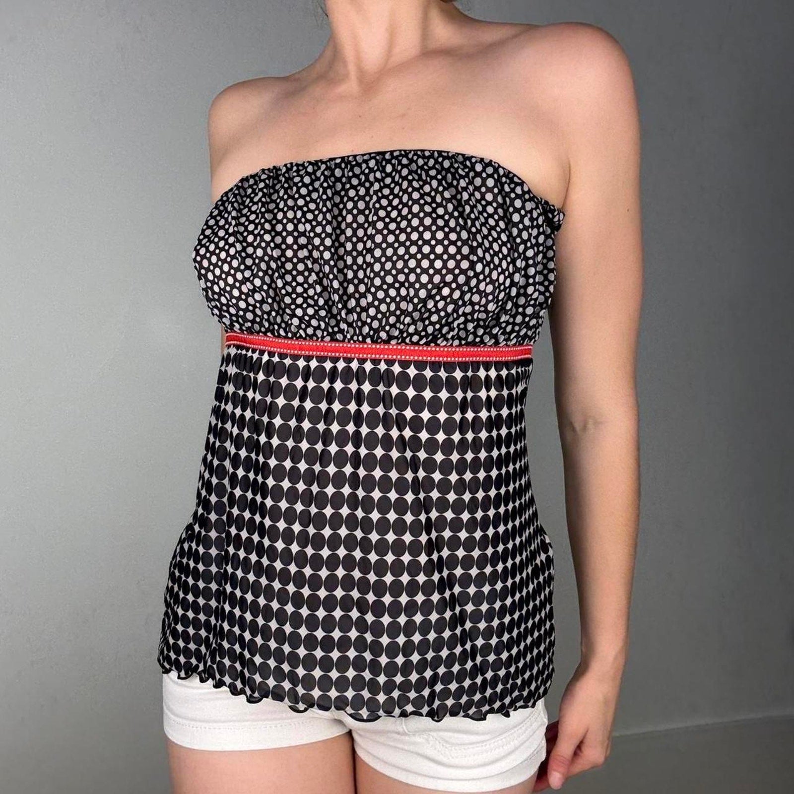 Black white polka dot strapless bandeau top going out party summer — fits like size medium from Charlotte (see measurements below!