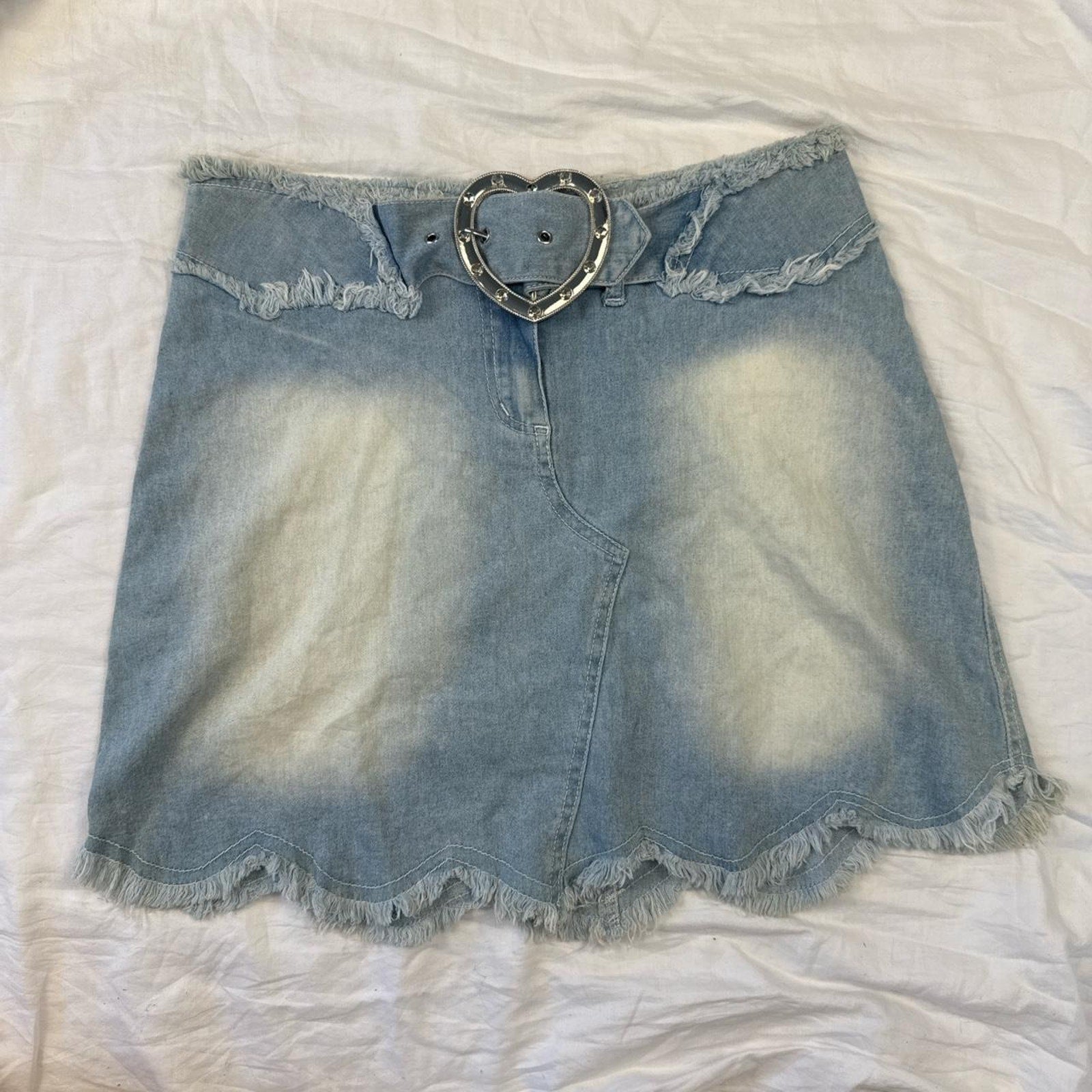 Y2K light wash faded mini skirt denim heart belt buckle raw hem frayed distressed acid wash - size 29/32 from donnaio - likely fits like modern medium (see measurements to ensure fit)